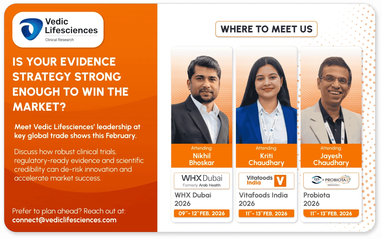 For over 25 years, Vedic Lifesciences has been at the forefront of clinical research, shaping how science translates into trust and growth. We don't just conduct studies — we create credibility that strengthens innovation, accelerates regulatory acceptance and positions brands for global success. With proven expertise and a commitment to results, we align innovation with validation, compliance with speed and clinical endpoints with real consumer relevance. Every project is built to deliver not only scientific rigor but also measurable impact. In a world where promises are plenty but proof is rare, the next generation of future-ready wellness leaders will rise on the strength of evidence that builds trust, drives growth and endures. Vedic Lifesciences stands not just as a research & regulatory services provider to execute this journey, but as an intellectual partner and thought leader guiding brands to lead the market with proof.