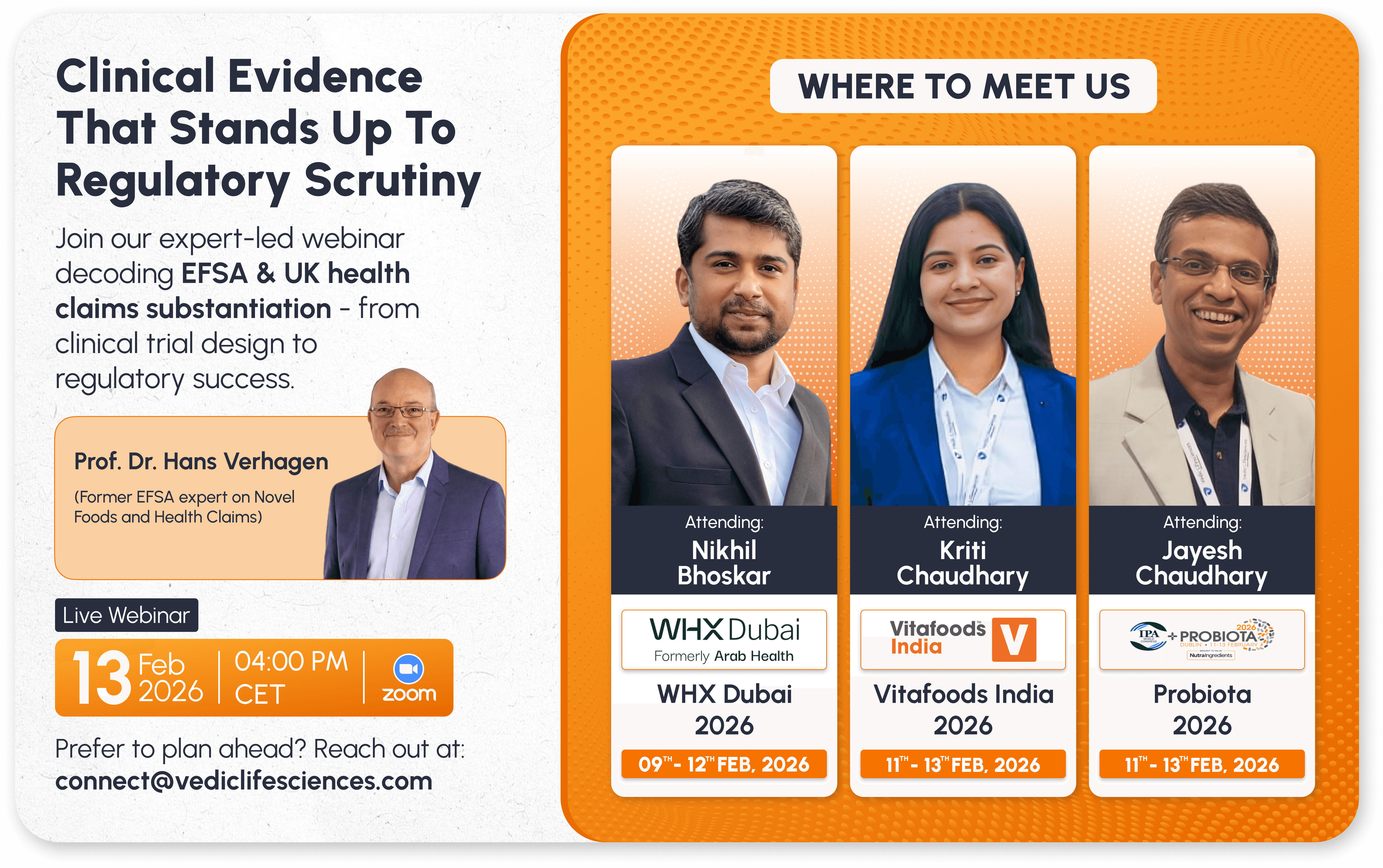 For over 25 years, Vedic Lifesciences has been at the forefront of clinical research, shaping how science translates into trust and growth. We don't just conduct studies — we create credibility that strengthens innovation, accelerates regulatory acceptance and positions brands for global success. With proven expertise and a commitment to results, we align innovation with validation, compliance with speed and clinical endpoints with real consumer relevance. Every project is built to deliver not only scientific rigor but also measurable impact. In a world where promises are plenty but proof is rare, the next generation of future-ready wellness leaders will rise on the strength of evidence that builds trust, drives growth and endures. Vedic Lifesciences stands not just as a research & regulatory services provider to execute this journey, but as an intellectual partner and thought leader guiding brands to lead the market with proof.