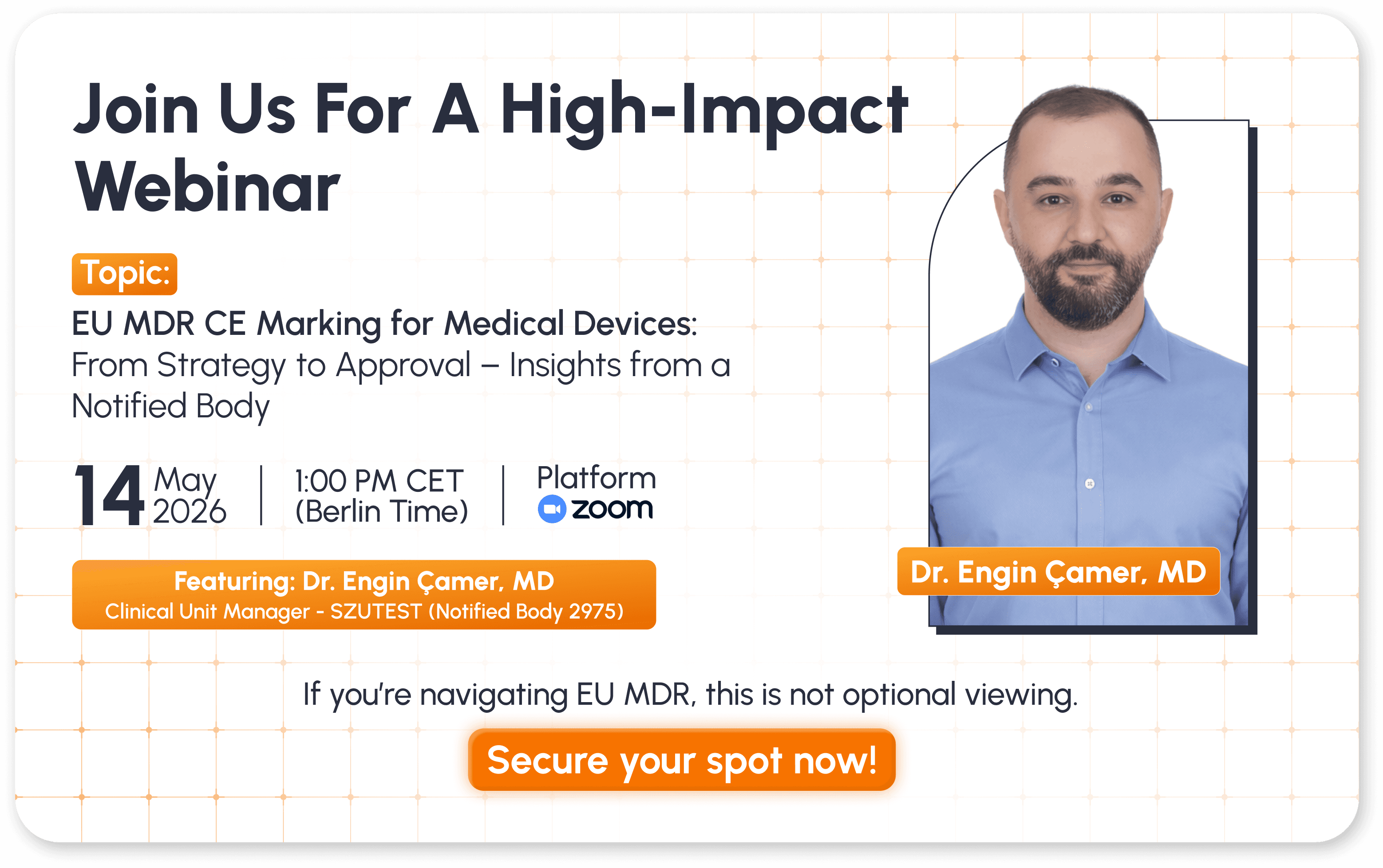 Join Dr. Engin Çamer, Clinical Unit Manager at SZUTEST (Notified Body 2975), as he shares expert insights on aligning your clinical strategy, regulatory approach and technical documentation with real-world Notified Body expectations - helping you reduce delays and improve approval success rates.
